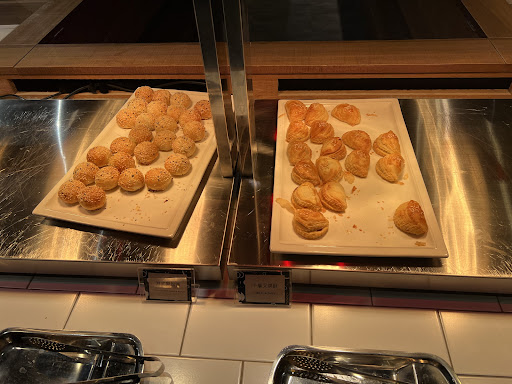 師傅現作的品項有雞蛋糕、法國吐司、歐姆蛋 原本很期待的歐姆蛋 吃起來很普 中心沒有滑嫩的感覺 起司再多一點可能更好 雞蛋糕是原味無包餡的 可以自己淋旁邊的醬 沙拉區的青醬菌菇沙拉跟煙燻鮭魚都很好吃 搭配生菜清爽無負擔!另外還有很多款乳酪可以配 旁邊還有水果跟優格區 而最角落的是各式麵包還有牛奶麥片 麵包種類很多 可以使用烤箱加熱 接著最多的是西式餐點 有現切火腿、薯條雞塊、豬肉腸、茶葉蛋、烤馬鈴薯、培根等等 德國豬腳的皮很脆 肉質也不會太乾柴 是熱門搶手菜! 最左邊是港式餐飲區 包含豉汁排骨、奶黃包、珍珠丸子、湯包、燒賣 應有盡有
