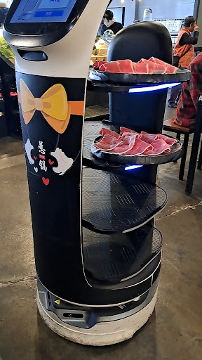 我是5/14晚上兩位第一次去用餐,首先要先給晚班外場的女員工和櫃檯的男員工好評,態度真的非常好👍👍👍 再來我遇到了一件覺得有點誇張的事情,本店機器人送餐服務是一賣點,但也因此出現一些問題,內場員工在準備好我們和隔壁桌的肉盤後,用機器人一次送出,機器人先到了隔壁桌,結果我就看著他們一次把機器人上面的食物全部拿走,我可以肯定他們是故意的,因為他們邊拿還邊看,而且拿的很手忙腳亂(緊張?),拿完全部給他煮下去,我沒記錯他們四個人好像一次拿了5盤肉,其中有一盤是我們的,所以接著機器人過來時,已經是空空的了,我就請了外場的那位女店員過來,就跟他說明我看著剛剛隔壁桌把全部的東西都拿走,他馬上過去告知,結果該桌澳洲人似乎表示他們已經全部混一起煮了,(鍋子其實不大一次把肉丟下去煮基本上會滿到不行),總之他們就是表明他們不知道是別桌的,以為全部他們的,(機器人上面明明有桌號,所以很明顯是故意),而且從這之後隔壁桌的就一直往我們這邊看,後來外場女店員只好跟內場告知重新準備我們的肉,過了一會送來我們的豬和羊,結果盤子很大肉卻只有各6片,其實我們也沒多想什麼就隨口苦笑說了一下,盤子這麼大怎麼只有6片😂😂😂,剛好外場女店員經過聽到,過來看了跟內場問怎麼只有給6片,內場告知因為新人不小心切太厚,我們就想說沒關係看起來好像是真的厚一點點,就跟店員謝謝沒關係這樣,結果過了一會女店員過來跟我們說,等會會再補我們肉盤,因為她想了一下覺得是他們內部問題,對我們不太公平,我們很感謝她的爭取,所以又過了一下補了兩盤肉過來,看起來就滿滿滿的,這時候隔壁桌直愣愣的看著我們,我感覺他們os怎麼不用偷拿的,肉還比他們多😂😂😂 結論:說真的口味不錯,東西好吃!但流程需要再多修正,內場員工可能要再教育,外場兩位員工很棒👍如果再光顧,一定是因為那兩...