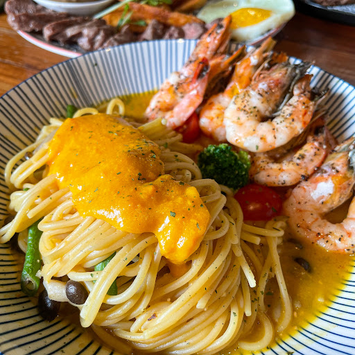 是說很少看到主菜搭配鹽酥雞🤣鹽酥雞還是正宗台式口味,雞肉感覺有醃製過還蠻入味的,咔滋咔滋的外皮鹹香撲鼻,而且肉肉份量真的爆炸多,端上桌時鹽酥雞滿到看不見義大利麵,就算真的吃不完也不用擔心,旁邊都有自助打包區非常貼心!