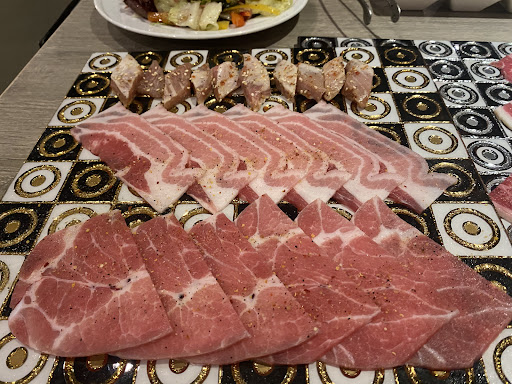 #冷藏安格斯牛小排、#伊比利豬梅花、#澳洲和牛小排、#澳洲和牛橫膈膜、#極上安格斯羽下嫩肩、#西班牙松阪豬、#台灣放山香草雞腿肉,烤肉類的時候服務生也都會在旁,如果有不會烤的也可以詢問他們,烤的時候可以用"舒芙醬"增加肉的風味,建議先吃原味再吃有醬料的,可以吃得出不同口味,肉類最喜歡的是 #伊比利豬梅花 可以吃7分熟的豬肉,超級軟嫩多汁,根本像牛肉的口感阿! #西班牙松阪豬 油脂比較多、脆口多汁,非常喜歡,#澳洲和牛小排 沾店家特製的舒芙醬或是灑玫瑰鹽都很讚!