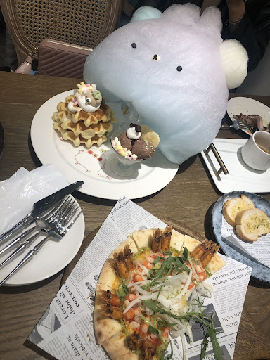 Cute fairy floss with waffle:) bit pricey but okay service still very nice. Price range around 300/per pastas, main course or pancake. Drinking menu about 150 ish with 10% tips. Good place for afternoon tea if you wanna have a break.