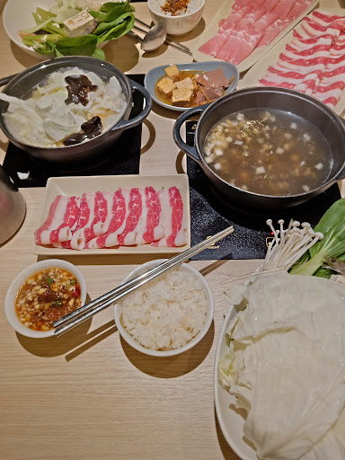 點餐先選鍋湯底,石頭鍋內涵洋蔥碎塊,湯頭香!涮涮鍋使用高湯,一樣好喝不油不膩。