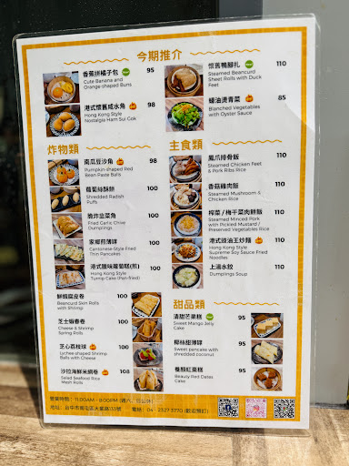 首先蝦餃裡面的蝦肉不是整支,是很細碎的,吃不出來彈牙的口感,甚至有點像水餃的內餡。鳳爪和排骨的味道非常神奇,你不能說他好吃或是不好吃,我只能說他跟我吃過大部分港式點心的鳳爪調味不太一樣,而且是令人不習慣的那種。煲仔飯的飯本身又乾又鬆又澀柴,這個跟粒粒分明或是香米類比較鬆的口感完全是兩件事,配上不知所云的醬汁,我真的是很難把它吃完。虎皮卷帶有明顯燒焦的味道,雖然表面看不出來。酥脆感是有的,內餡料偏少,整體的比例不太勻稱。蠔油青菜就沒什麼好評論的,把它當燙青菜吃就對了,不難吃,但也不特別美味,偏鹹了一點。鹹水餃的皮剛炸起來軟糯還可以,但是內餡完全不對,有點像把滷肉飯的滷肉塞進去的味道。流沙包都是裡面,我覺得最好吃的一款了,麵皮Q彈,流沙內餡油量放得夠多讓他冷卻以後依然保有爆漿的狀態,雖然不太健康,但是就是要這樣才好吃。
