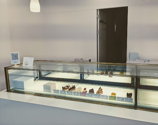 Sophisticated counter serve featuring colorful desserts with fruit & other decorative toppings.