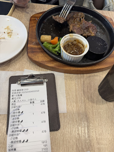 Read more許多網紅推薦,特別一個人來踩點, ——環境—— 挑高的寬敞空間以及動線都還不錯, 裝潢很有品味,理當是舒服的用餐空間, 但這次入座的A10座位,地板不平導致桌子非常的晃! 店家是知道這件事的,因為他們底下還墊了一張紙板,但根本毫無幫助⋯ 吃排餐大家都會用刀叉切,整張桌子會像是四級以上地震在晃,飲料會瘋狂從杯子灑出來, 為了那張桌子,吃牛排還要切的小心翼翼⋯ 配上這裝潢真的是可惜的金絮其外,敗絮其中, 用餐體驗原本很滿的結果直接扣三分! (2/5分) ——排餐—— 牛排上餐後,當鐵蓋掀開的那個瞬間, 那塊牛肉非常肯定地告訴你:「我是點自助吧贈送的牛排」, 可以誇獎的是吃起來沒有使用太多嫩肉精和過度調味,所以吃得出牛肉本身的味道而非夜市牛排,這點我給高分(喜歡吃很嫩牛肉又不想花大錢的麻煩吃夜市牛排就好),可惜的是我點五分可是出來的是七分,這真的沒辦法救了,連牛肉熟度都控制不好的牛排店真的很難說服我給予高評價! 排餐附一點點蔬菜(紅蘿蔔、花椰菜、玉米筍)即使放在鐵板上,入口瞬間還是冰的⋯這點我不行, 以上是排餐的部分,整體我會給2/5分,不合格,但因為不是泡嫩肉精夜市牛排口味所以再多給一分(3/5)。 ——自助餐—— · 沙拉 (食材新鮮、種類豐富、除了千島醬還有橙汁油醋醬,滿分5/5)。 · 披薩 (網友們廣推的料理,吃起來還不錯,因為口味眾多所以沒有寫出是什麼口味,但還是希望甜食能分開出來,有一款不知道是啥結果吃了是「紅豆湯圓披薩」,義大利人生不生氣我不管,但害我無預警吃到甜食我不行,4/5分) · 越南河粉(滿分 5/5),大推必拿! · 炸物(同其他網友說的就是便宜冷凍炸物,本來想說沒有太多期待也不會有傷害還能給個4分,結果當我吃了一個以為是雞塊的炸物,沒錯他又是甜食!超噁心的玉米濃湯可樂餅,真的拜託稍微標記一下食物名單!3/5分) · 蒸籠區(冷凍燒賣包子等等,沒有騙人的甜食混在一起放,4/5分) · 麵包(中規中矩附上各口味果醬,4/5分) · 湯區(牛肉羅宋湯5/5分大推,玉米湯不在我的口味上⋯3/5) · 飯區 (有咖喱飯跟肉燥飯,醬的調味中規中矩沒特別突出的部分,但是飯煮的非常軟爛,介於白飯跟稀飯中間,不曉得是不是因為平日中午幾乎都老人家怕他們牙口不好,但這個白飯我真的不能接受,也是我今天唯一吃了一口就吞不下去而浪費的食材,1/5分) . 中式快炒 (中規中矩,可惜吃起來都不熱,那些加熱器應該只是裝飾用的,我對於中式料理還是有溫度上的期待,尤其那個麻辣鴨血吃起來根本常溫,安陵容在後宮覺得冷,用這個鴨血也暖不了自己,2/5分) · 飲料(品項中規中矩但沒有廉價感品質都不錯,咖啡機只有一台太少,導致一直大排長龍,4/5) ·冰淇淋(杜老爺,口味全都打安全牌,只有情人果平常比較少吃,4/5)