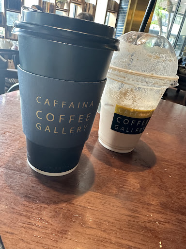 The first thing striking about any caffaina is it's natural glam interior and atmosphere- full of woods complimented by marble and gold accents. Placing nature and calming warm woods at the center to calm the mind with elements of glam and culture to elevate what could have been more like being in the woods, but instead like being in a cabin with elegance.... also evidenced by books and images from wall to ceiling. Coffee is obviously the center point of this store as they have drip/siphon coffee and their coffee bean machines. Sprayed throughout are displays of the breads, pastries and cakes they make daily.