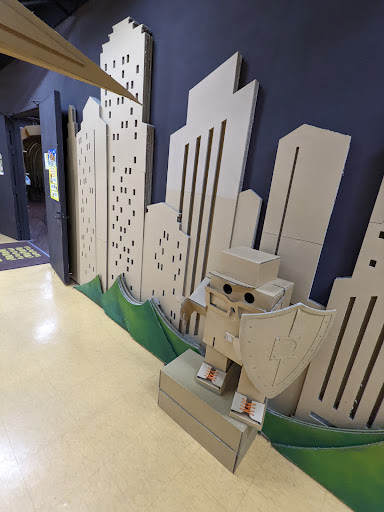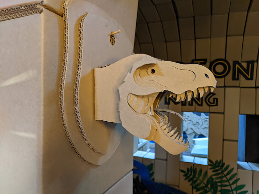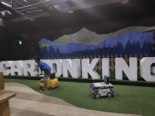 Interesting place to experience one time, likely wouldn’t go back. We took the elevator on street level down to get to Carton King. Downstairs, the restaurant is very dimly lit. The front entrance to the restaurant is between a large cardboard jeep and dinosaur. You’ll need to make sure kids are careful as they cross the tracks. Besides the restaurant, there’s a store inside as well with items made out of paper and nostalgic toys.
