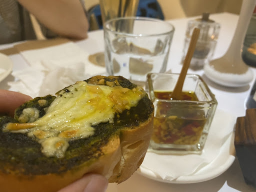 治療的青醬麵包~ 店家貼心的附上~ 一碟特製蒜辣橄欖油。。。 只需加一、兩滴…… 。。。 提鮮似的挑逗味蕾。。。 讓青醬麵包的滋味。。。 完美無缺的更上一層。。。