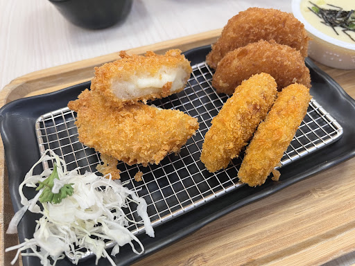 3、綜合可樂餅定食$228: 起司+野菜+咖哩各1片,麵衣很酥脆,內餡鬆軟馬鈴薯綿密,起司奶香濃郁,野菜裡面就是三色豆不太愛,咖哩口味像營養午餐,最推的是起司口味。