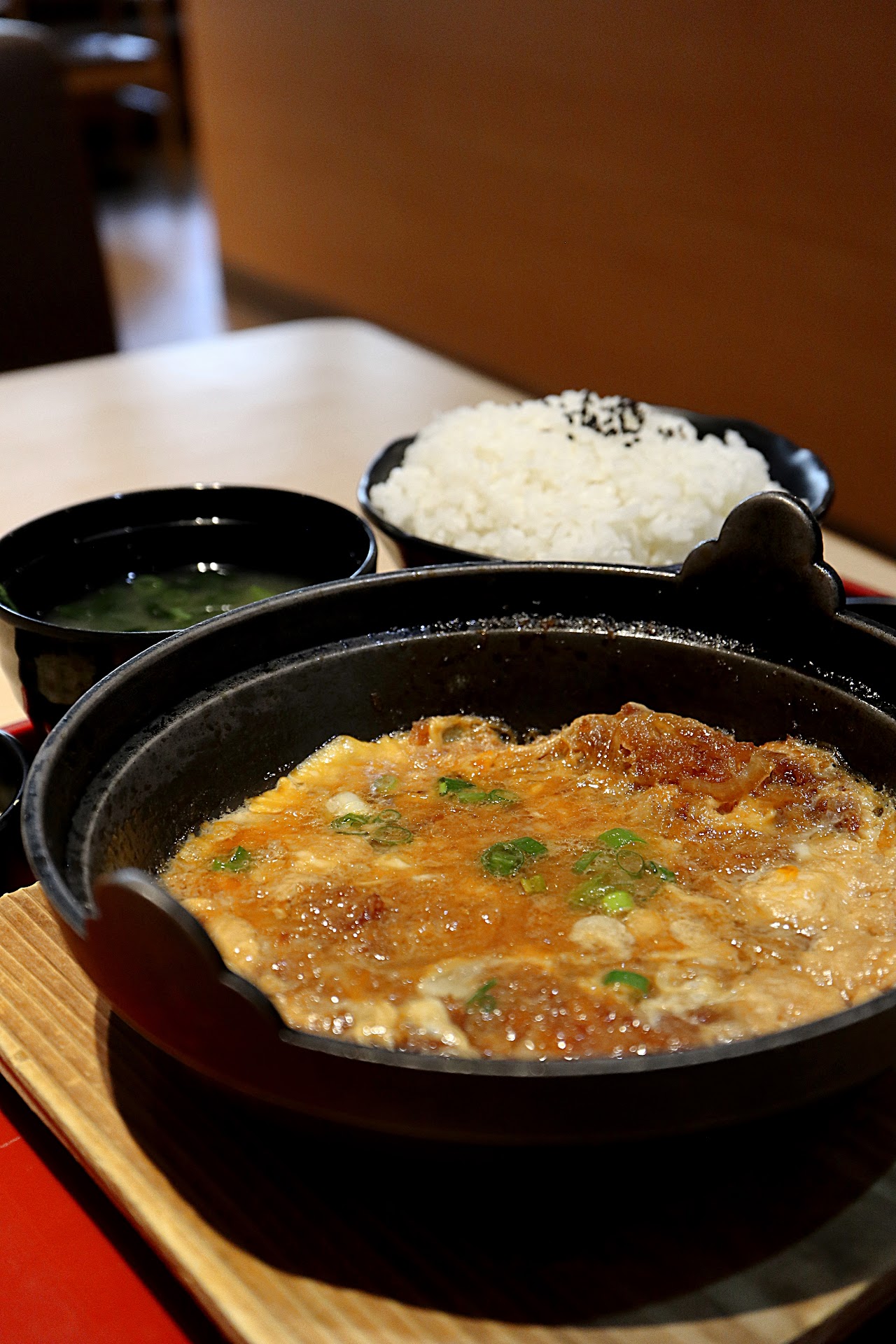 「黃金豬排煮定食」 薄身的炸豬排,再用洋蔥、醬汁和蛋液一起燉煮。 除了主菜以外,還有白飯、味噌湯和小菜。 豬排外皮吸收了湯汁,最適合用來下飯。 牛蒡爽口帶微辣,很過癮。