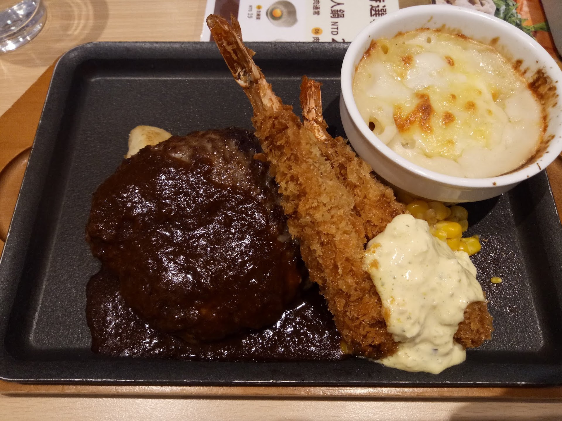 日本連鎖的家庭餐廳在台中米平方商場開幕 店內位置規劃非常多 但座位不大 餐點種類繁多 最一般的丼飯、鐵板料理、焗烤、烏龍麵到鍋物都有 可搭配的選項也很多樣 沙拉、飲料吧... 如果不清楚也可以按鈴詢問服務人員喔(畢竟有收服務費) 圖為 漢堡排日式炸蝦焗烤斜管麵拼盤 另外會加贈白飯或麵包 漢堡排外皮有些過焦 下刀的時候能明顯感覺出來 搭上多蜜醬 微酸且帶出洋蔥和肉的香氣 肉排算是蠻厚實的 裏頭肉汁沒有很多 會咬到筋的口感 另外在底下有零散的馬鈴薯塊 炸蝦 個頭很迷你的兩尾蝦 搭上塔塔醬 酸黃瓜很解膩 炸蝦麵衣很硬 內裡蝦肉也只算普通 焗烤斜管麵 起司的焦香味非常誘人 奶油起司和管麵搭配我很喜歡 附贈的麵包像是沒有餡料的餐包 會一同附上奶油自助使用 麵包的外皮也蠻硬的...