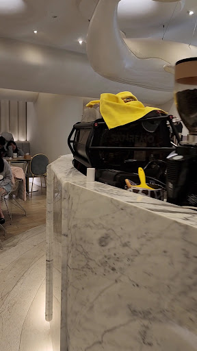 They gave us a table in a separate glass door enclosed area with high top tables. The lemon meringue dessert actually tasted kind of off like milk gone sour but the matcha tart was good. I actually forgot that I came here for the sugar-glass component so I tossed the vase covering the lemon cake when my partner told me it was plastic and obviously inedible. 😅 Therefore, I missed out on the chance to lick it. Overall, this is a beautiful spot with high class Vegas vibes and I totally...