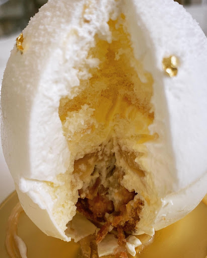 This place popped up on my radar because of their unique glass-blown sugar desserts. They looked divine. The minimum consumption is a drink or an ice cream. Of course, I ordered the ice cream because it was a welcome change and I am so glad I did! It tasted more like a gelato and came with a flaky whale 🐋 cookie. You can choose two flavors AND the portion was generous.