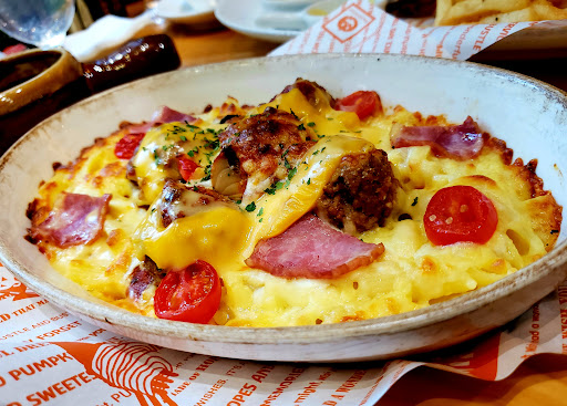 Now then, the food!!!! Yes my friends, the main reason why you clicked on this page on the first place. Is it good? Is it worth it? Should I try it? Yes...Yes...and YES. Absolutely one of the best places to get a pasta dish here in Taichung! I am lover of Italian food and my lord has this restaurant gone above and beyond my expectations. The main dish I ordered was the New Orleans Meatball Gratin with penne. An amazing dish packed with flavor and ingredients that tasted delicious and fresh. The meatballs were so tender and juicy, that I assume the chef must have handled them with love, like a newborn on Halloween. The dish is covered with melted cheese that warms the soul right up! Speaking of warming the soul, their signature pumpkin soup is worth a try. Creamy and thick with taste of pumpkin and bacon, who would've thought of a combining these two ingredients? But let me tell you it's genius and most importantly delicious! The restaurant offers sets, which can include a salad and soup and a dessert. Depending on which set you choose you'll have a chance on trying all 3. Try the fresh vegetable salad wich is accompanied by an amazing blueberry yogurt and peanut butter dip. (Which you can always ask for more dipping if you wish). Although, I wasn't able to try any of the desserts, (this time) I was able to try their appetizers. It was well portioned. Filled with crispy fries, golden potato wedges, cheesy mozzarella sticks, mouth watering chicken bites and so much more, it's worth giving a try my guys but be warned, don't fill up on it 😉!