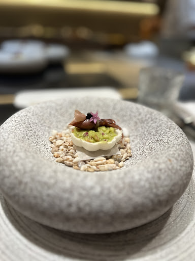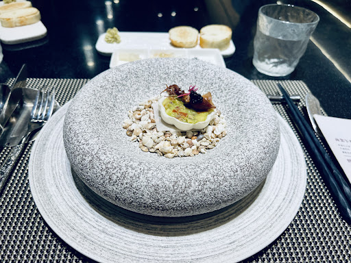 1.銀烏賊佐酪梨莎莎🦑 口味酸甜蠻開胃的,擺盤很漂亮! 2.煙燻干貝絲瓜濃湯🍲 干貝先煎過,再以煙燻增加風味,搭配枸杞、蚌肉跟鴻禧菇,湯頭應該是海鮮熬煮加絲瓜打成泥做的,但調味很清淡。 3.肉夾饃🥙 自製的麵皮,兩面煎的金黃色,層次分明且外酥裡嫩,也不會過油,滷肉部分有加馬告,會帶點淡淡檸檬香,肥瘦比例約1:3,搭配青椒跟洋蔥👍 4.沙拉:索蘭默白蘆筍(應該是這樣叫😂)、伊比利豬火腿、炸鵪鶉蛋佐松露白醬,醬汁部分奶香濃郁配松露非常好吃,蘆筍是乾煎的,吃起來很清爽且水分很多。 5.澳洲水姑娘龍蝦🦞(兩吃) 一吃:乾煎搭配泰式紅咖哩醬、椰奶醬,肉質很Q彈🤤 二吃:山藥雲丹燒:海膽、海蜇皮,起司、百里香。 本以為起司會很搶味,但海膽跟蝦膏味道很濃郁且帶有白酒香,覺得調味很平衡,特別是蝦頭還有滿滿的肉,吃得很滿足😋 6.南非活鮑魚 鮑魚肝醬、牛血葉、羅勒油(九層塔)這道做比較原味,個人覺得肝醬比鮑魚好吃,很濃郁的味道,很特別,而且聽師傅解說才知道原來鮑魚有牙齒😂 7.主餐:櫻桃鴨...