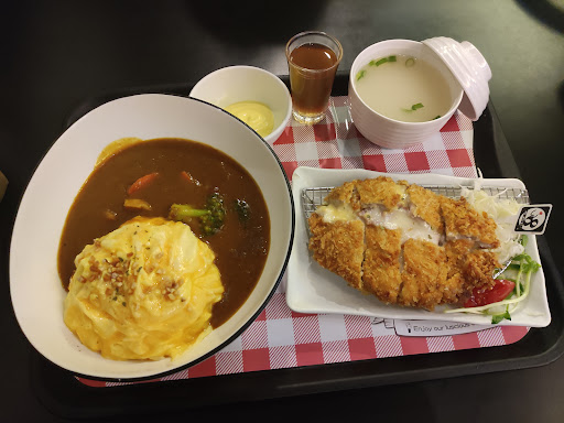 Pork Cutlet Cheese Curry Omelette Rice (280 NT) This look so fabulous, especially when you can clearly see the cheese inside the pork cutlet melting slowly... such a mouth-watering scene~ As you can see in the picture, they also give some fresh sliced cabbage and small tomato cut in half in order to cut the grease of fried pork cutlet, and the pork cutlet itself was served on steel net so that it won't stick on the plate (not look so oily either). The curry taste very good too, and the omelette is so smooth. Both of the curry and omelette support each other and brings you unforgettable flavor. They also give you miso soup (if i'm not wrong), and some of mustard sauce, not so bad to eat it with the pork cutlet. Nice food~