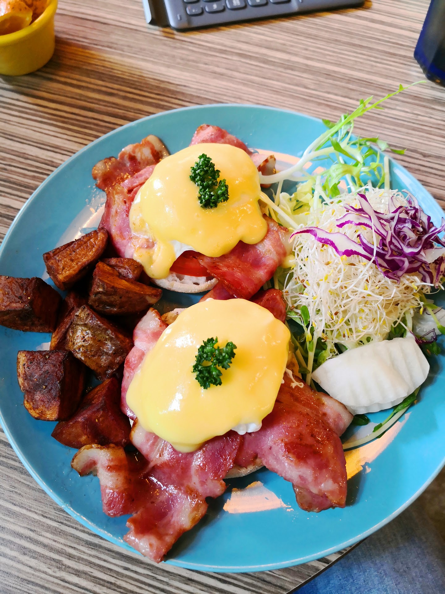 This is a Western-inspired Taiwanese brunch cafe with outside seating and a comfortable setting. My test breakfast is always a Benedict as it gives me the parameters I'm looking for. I like my muffin and bacon to be crispy which they weren't, the salad lightly dressed which it wasn't, the potatoes crsipy which they weren't, and my eggs to be free-range or organic which they weren't. Also, the prices are between NT250 and 350 which is not cheap. That said, the eggs were delighfully runny, the Hollandaise had a nice flavor and texture, and I was definitely full and feeling quite satisfied. My suggestion to the owner would be if you are doing well and your customers are happy and come back, don't change anything except try to get better quality eggs which is easy these dasy. If business is not that great then try to improve on some of the things I mentioned. I will check back in...