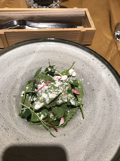 Read more套餐沙拉的貝比生菜灑些冰涼的橄欖油脆粉配上底部的蟹肉絲,亮點應該是橄欖油的分子料理手法,但如果淋點柑橘類的酸味提升海鮮的鹹鮮味或是再灑點微辣或麻的舌觸覺中和生菜的微澀味,海鮮的蟹味會比較跳脫出來。 菇濃湯的奶脂味遠高於菇鮮味,倒有些可惜,但炸金針菇與小食用花和底部的乳沫裝飾(松露香緹味道太淡)有日式秋櫻落花的既視感。 綜合野菇的香氣不足與梅納反應完整的外觀搭不上線,菇的溫度偏低猜想可能是有放置一陣子讓香氣流失,也有可能是溫控和油脂的比例不對,雖是煎烤吃起來卻像淺油炸,少許雞汁與生蛋黃佐以帕達諾起司和平葉巴西里醬汁味道合拍,卻有些單調可惜。 千層外部酥脆內部層次堆疊,馬鈴薯切片偏好再薄一點口感較柔和,刨有鹹蛋黃粉和蝦夷蔥,雖單吃略乾並無亮點,但特色在於焗烤過的白醬乳沫和底部溼軟的肉醬搭配,算是肉醬麵的不一樣詮譯作。 桂丁雞肉串一串80,肉味足醬濃帶有點焦香但未四溢,一點的大蔥、綠捲鬚芽和食用花外觀皎好,但一串配比3顆鮭魚卵的雞油味不足美奶滋,和配比一片薄苦瓜、一粒1/4塊的櫻桃蘿蔔漬物,略顯不夠大氣,且仿日式明顯但無新意。 BBQ中卷服務人員提到底部是polenta但實際是玉米糊purée,可能是菜單有換過的口誤,中卷有BBQ醬味但沒有燒烤的燻香味,應該改名BBQ醬中卷較適合,炙燒柑橘塗點cointreau再燒味道會比較有深度,配上無調味的炸蘿勒,確定是沒有吃到菜單上的西班牙臘腸味,整體味道算平衡但有點小淡不夠過癮。 PI叉燒醬味停留表層,筋肉還有待軟化的空間,應該還不到可供應客人的最佳程度,服務人員說明和菜單一致的娃娃菜,實際上只有壓在肉下的一小片娃娃菜芯,覺得沒有特別說明的必要性,竹筍薄片與豬肉擺盤美觀但口味搭配有點老梗,如果多了豬脂與筍鮮香的結合味或許會更有驚艷感。 燉飯米粒帶有些許嚼勁,溫和的海鮮底味和火腿的鹹鮮提味,熟嫩的干貝和墨魚脆片,算不錯了!但墨魚醬再收濃一點點會更好。 手工麵餃份量感足,ricotta起司口味偏甜,應是符合茹素人士所調整,菜單寫蕃茄以為是蕃茄口味,其實是上頭幾粒蕃茄丁裝飾,容易讓人誤解。 主菜肉食伊比利豬上蓋、鴨胸皆是單點(牛小排是套餐)但份量像法式套餐一樣的小份量,鴨胸給一般店家的一半,但菜單上均有註明重量,價格也算合理並無問題,應是希望客人能多點前菜搭配吃的策略!主食肉皆軟嫩、熟度合宜,溫度偏低、焦香氣味不足,應全是低溫烹調而非直火烹調出餐方式,唯獨鴨胸皮有塗醬汁再煎過顏色較深可掩飾些,但整體較無需要火侯拿捏的技術性,實在可惜。 甜點奶酪、挖綠哈蜜瓜球、小黃瓜果凍、咖啡油、冬瓜糖汁液、薏仁,風味合拍,但強度不夠印象平淡。 卡士達塔酥皮雖偏厚實但香氣味道足、溼度剛好,卡士達內餡像烤布蕾,與鑲櫻桃果醬的櫻桃水果和椰子冰搭配雖中規中矩,但合乎完美。 今日三個人午餐想多嘗試些不一樣的菜色,就完食了整份菜單約3/4道數,共食了十五道,因每道份量不多肚子就剛好飽而已,但內心有點小空虛!三個人吃完五仟多其實也還可以接受。