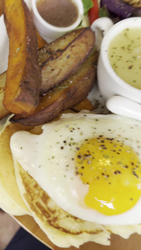 Read moreI arranged to meet my friend here for brunch and luckily they had plenty of seating available when I arrived. I didn’t reserve a table or anything. I was seated upstairs in a nice bright room. You have to order and pay and I really wanted a latte as my friend was running late. I ordered my iced latte ($130) and then sat back to look through the menu for food. I went back down to order the pan fried chicken breast savoury pancake deal ($340). The latte was perfection, just the way I like it. The meal was delicious. I almost ate every bite. I just felt too full towards the end and couldn’t finish my soup. The pancakes were great. The meat was good too. Everything on the plate was finger licking good. The waitresses were adorable and very...
