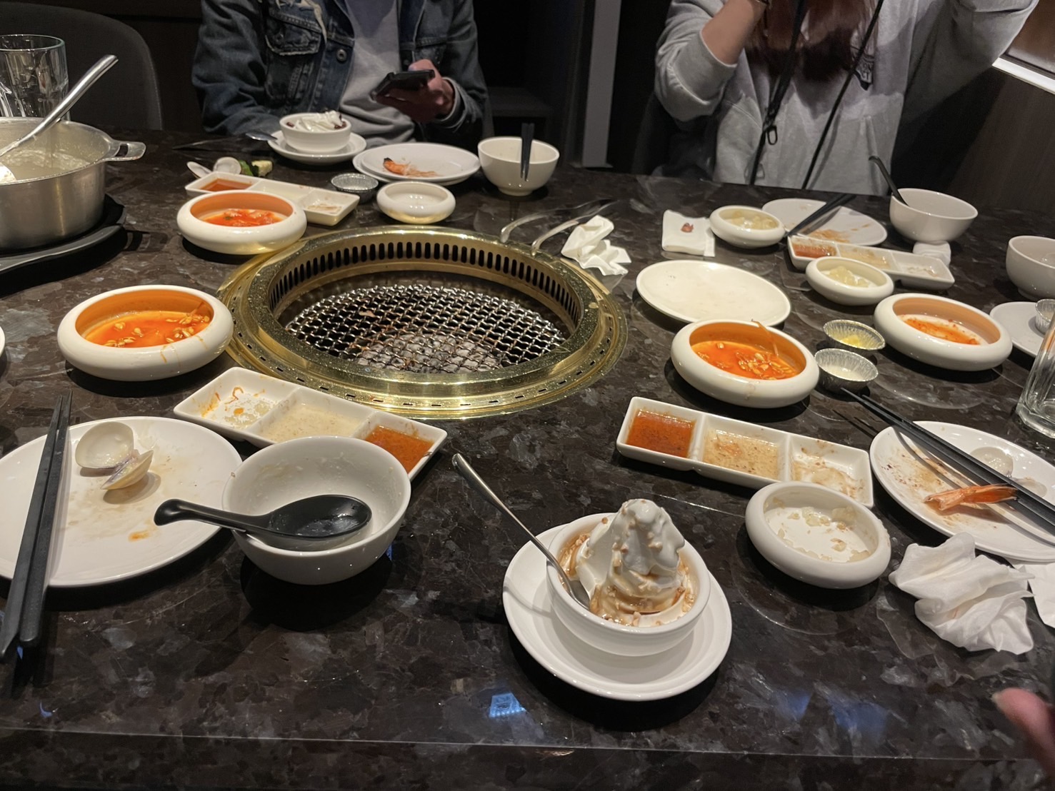 第一位女服務同仁 有常幫忙換烤網 她前面有說她可以幫忙烤蝦,所以 蝦子就這樣擺到餐期尾巴 中間有提醒兩次 都沒有烤 直到交接班 男同仁來 也提醒兩次 直到我們自己把蝦子放到烤網才說明可以幫忙烤。 心想假如你們沒有這個服務 可以不用跟我說 我可以自己烤 沒有關係的!