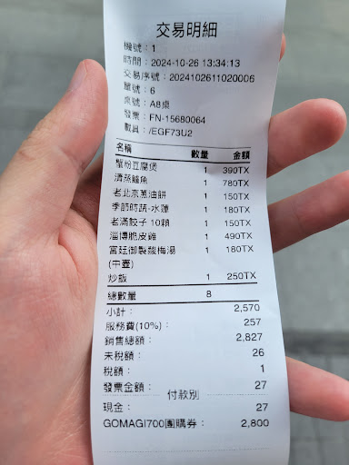 ㈤餃子˙麵點: ➊老北京蔥油餅$110:有6片,是厚蔥油餅,外皮酥脆,但吃到後面好乾。 ➋剝皮辣椒燒賣(8顆)$240:大顆且口感紮實,辣度有,但沒有什麼記憶點。 ➌👍老北京炸/麻醬麵$130:這道個人喜歡炸醬調味,醬自己加,別加太多不然會鹹,用料豐富,麵條有彈性,還不錯~ ➍松花皮蛋豬肉餃🥟$140:餃類皆10顆,皮蛋味不明顯,但整體有種很特別的味道。 ➎老滿餃子$140:內餡有蝦仁、豬肉、韭菜、雞蛋,個人不愛韭菜....吃一顆就不行了。 ➏👍豬肉三鮮餃$140:內餡有蝦仁、豬肉、烏參、魚板,3款中最愛的口味,大顆鮮甜,幾顆還吃得到湯汁。