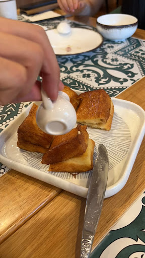 法蘭西哆士(花生) 看起來是熱量很高的一道料理,但一定要點好嘛!!!真的是非常好吃的甜點!微脆鬆軟的吐司外層把奶油均勻抹開後切開會有濃濃的花生流出來,看似乎很油很甜膩,但其實並不會,大小掌握得很剛好,就算是自己吃完一份也不會太膩的大小。