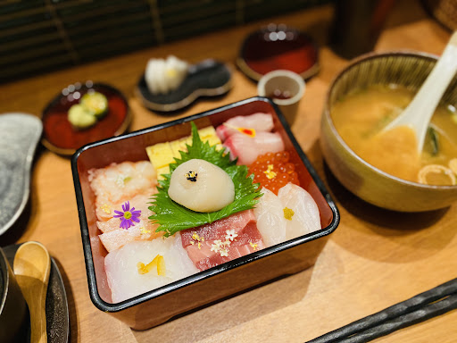 「豐」是店內主打的豪華丼飯,一次可以吃到九種不同的食材,對於選擇困難症患者來說超適合!裡面有鮭魚、鮪魚、紅魽、干貝、紅蝦等,每一口都很新鮮,鮭魚卵更是鹹香濃郁,搭配玉子燒的甜味,整體層次非常豐富,吃起來不會膩,一次滿足。