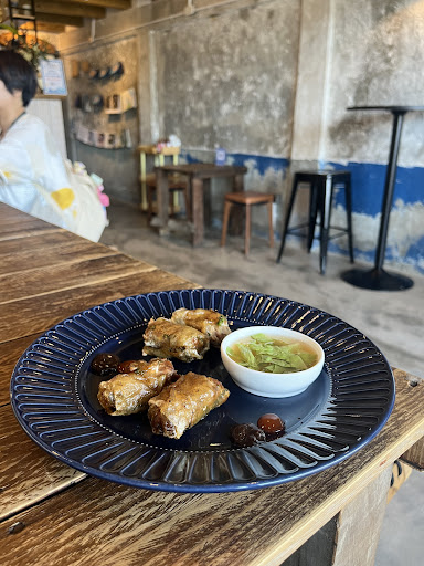 店內的飲品基本上都有供應,我目前最喜歡梅釀氣泡飲(蠻清爽、不會到很over的甜)(忘記拍照) 甜點通常需要看線上菜單才知道有什麼(蛋糕被朋友吃掉,沒拍照) 正餐有來吃過滿多品項(蹭朋友) -咖啡炸春捲蠻有特色,個人比較喜歡它的醬汁配生菜(藍色盤子拍很久拍不好),但我吃不飽,建議搭配其他品項 -生春捲必須要趕快吃,米紙會黏在盤子上,醬汁跟炸春捲一樣,蝦子很鮮,但我吃的是破碎版的春捲(夾不起🤓) -牛肉河粉的肉很好吃‼️很嫩但又很有嚼勁😻麵體也是超讚,我自己覺得跟越南路邊小攤有點軟軟的不太一樣,它們的麵很Q(會吸湯汁但不會變很軟爛?不知道為什麼)湯(應該是大骨湯)很濃郁,有淡淡的甜味 -烤肉麵包料是滿的,裡面的肉有點韌性,有醃過,是我蠻喜歡的味道,不會膩,法國麵包也有酥