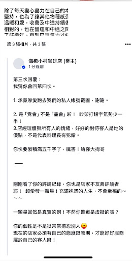 3.第三次回覆 店內有監視器 麻煩料理長王先生 老闆周小姐 調閱一下當天畫面 當下是王先生的口氣剁剁逼人