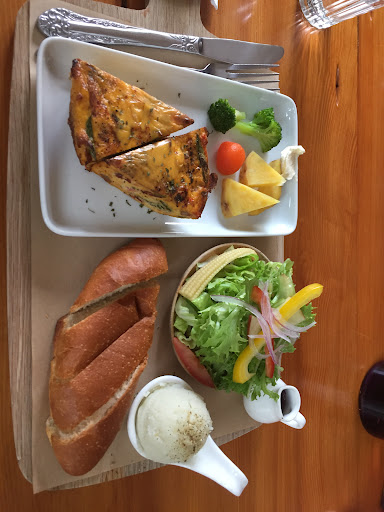 Read moreThe setting here is very pleasant - set behind its own little garden, it's bright and cheerful. However, the meal choice is very limited: either an omelet or a sort of sausage-meat quiche. The former is made to order, the second reheated. When it's served, we find that that's the only part that's warm - cold tomato and sweet corn, cold mashed potato, cold broccoli, cold sliced potato. Although they can manage to reheat the quiche, they said they couldn't reheat the rest for us. We had to insist to have some salt and pepper. And all for an expensive NT$250 per dish.||On the other hand, they can supply an espresso - quite rare among all the drip coffee of Taiwan's coffee culture. They also do a sort of milk shake - milk mixed up with jam, in my case strawberry. They could do with using the blender some more, and faster, to blend in the fruit - too many lumps of strawberry - but at least they use good quality jam.||All-in-all, a big disappointment.||(We didn't stay here so can't review...
