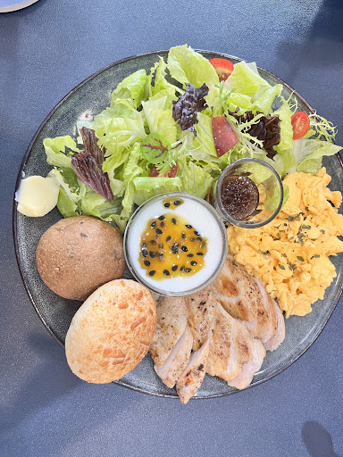 Isigny伊斯尼奶油嫩雞胸 雞胸肉質香嫩帶有厚度,吃起來不會乾乾柴柴,而且這肉看起來很有飽足感,好大塊🤣。餐盤上生菜附上蘋果醬吃起來酸酸清爽開胃,優格上面是自製百香果醬酸酸的還帶有果醬甜味。炒蛋也很開胃有稍微焦香味,麵包很軟嫩兩種口味一個是帕碼森起司,一個是水果雜糧球,兩種麵包香氣十足,小姐介紹可以抹上奶油才不會乾,我是沾點優格醬吃🙈