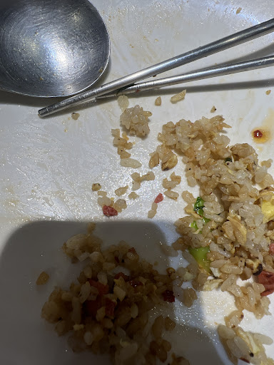 既然沒得選,只好點炒飯,結果更傻眼。端上來時看起來還好,但吃起來居然有苦味跟焦味,仔細一看,飯裡有一些黑色小點,推測應該是鍋子太久沒洗,或是上一份餐的焦渣沒清乾淨,就直接拿來炒飯。這種苦焦味的炒飯居然還賣一百多,真的不行。