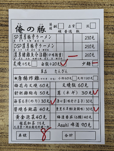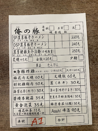 ▎店家:俺の豚 ▎區域/鄰近地點:台南市永康區東橋一路250號 ▎用餐時間:2/2(六) 17:30 ▎排隊狀況:有,開店前約快10位 ▎拉麵名稱/價格:SP濃厚豚骨拉麵/220 ▎配置:湯鹹、麵硬 ▎延伸:#一天三碗...