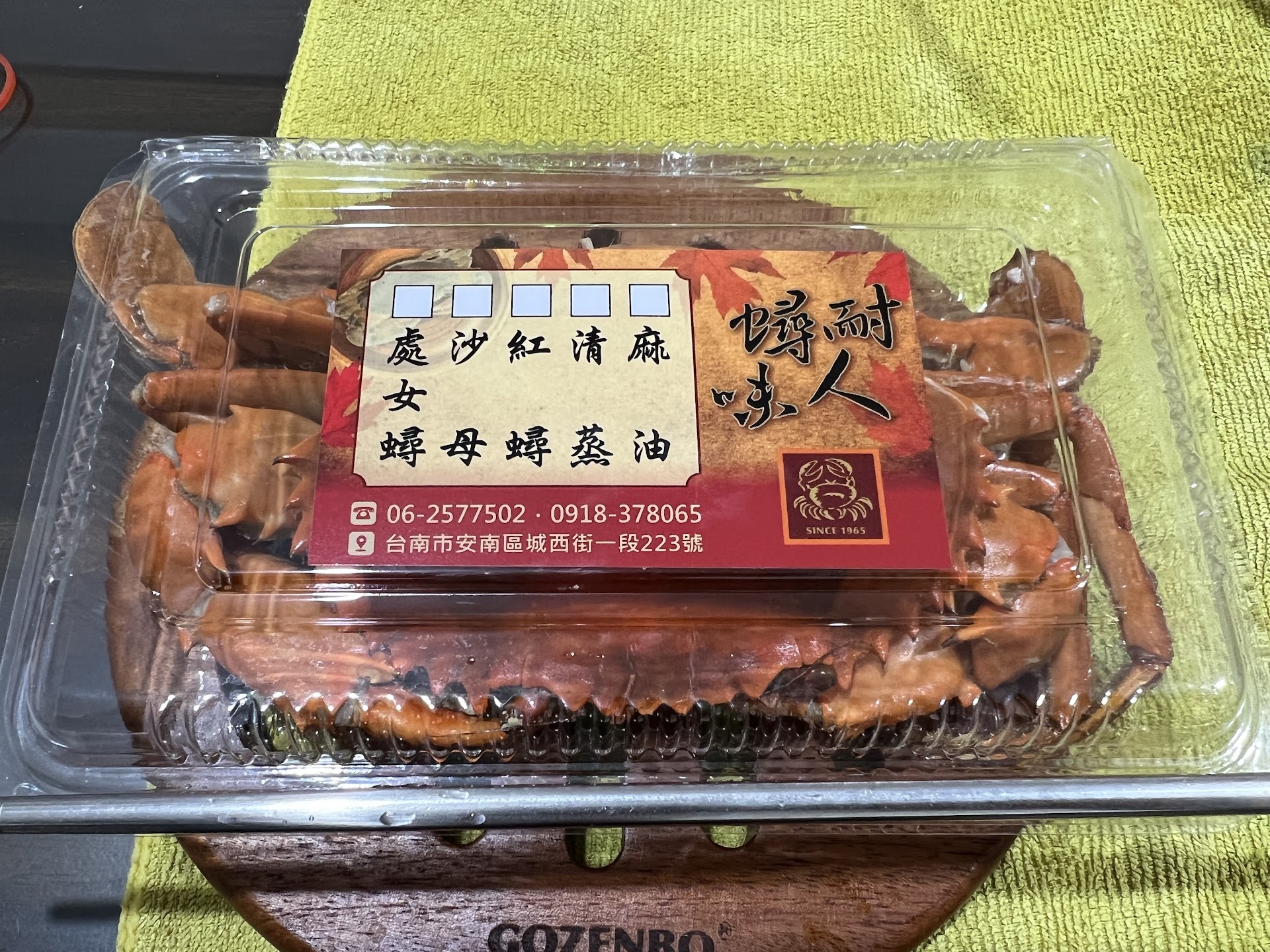 Read more一定要事先預訂,不然會等到天荒地老。 這次先打電話預訂,一個小時後去取。 假日不提供麻油口味只有清蒸(據說是太忙做不出來)。 請老闆挑了三隻紅蟳做清蒸,三隻價格大概1500左右,每隻真材實料,蟹黃飽滿,螃蟹很新鮮蟹味香濃,蟹腳肉也不會軟軟爛爛的,小朋友也愛吃。 店面離台南市區有一小段距離,地點稍微偏僻一點,附近也不是很好停車。所以再強調一次,一定要事先預訂,或是前一天先預訂隔天再去拿,才不會買不到或是在現場等料理等太久(附近真的沒...