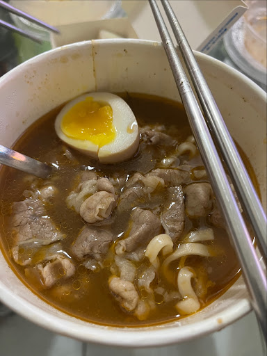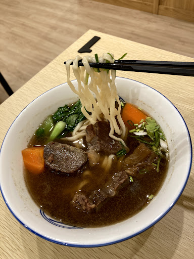 我自己不會覺得麵很多湯很少肉很少 份量都剛好 湯頭簡單說就是~ 特別,味道重,但很好喝! 之前我沒有在外面喝過這種口味,確實比較重,但並沒有死鹹,不是加鹽或調味品而來的,真的蠻深度的湯頭🥺 覺得麻麻的尾韻反而是加分 麵體很好吃,有嚼勁又軟Q(叫製麵所有道理😹) 跟湯一起入口,在有那麼多不同滋味的情況下 還是吃得出麵條本身的美味,而且有吸附湯汁的香氣,有一種感動 加上具有油脂、比例適中的牛肉片(喜歡口感!對牛肉沒有研究,但我很喜歡) 真的每一口都超好吃超爽快!😆 (即時感想)