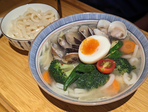 乾咖哩乍看之下有點像壓扁的漢堡排,類似乾炒咖哩肉醬,香氣爆棚;味噌蛤蜊烏龍麵的蛤蜊爆量肥嫩、湯頭溫醇甜美也是非常出色;配菜有櫛瓜青花菜完全不隨便;單點的酒蒸蛤蜊跟唐揚雞塊都很有水準;看了一下google...