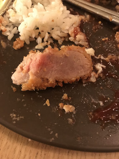 好不容易上菜了 一咬下去,豬排的中間是生的 先跟服務生反應了這點 服務生一句不好意思也沒有就默默收走 1分鐘後又端回來說「我們的豬排有兩種肉色,一種白的、一種紅的」 我告知他「你這塊肉左邊白右邊紅,可是中間完全是生肉的顏色啊」 又來一個像主管或老闆的,一來也是那套雙色肉的說法 我請她看一下生肉的部分,才換了一個說法 「我們的豬排是厚的,為了讓豬排嫩一點,中間都會炸得有點生」 我滿頭問號,豬肉不管嫩不嫩基本就是要全熟吧! 老闆後來客氣的說可以幫我再炸過,但我實在等太久不想再等,跟她說我挑掉那兩塊生的就好