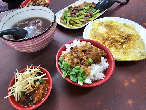大份的牛肉湯、炒青菜(大,份量超多)、蔥蛋、炒牛肉,就這樣快快的點了一份,而免費的肉燥飯餐檯,提供兩處方便大家盛飯,滷鍋也是兩鍋,重點是,滷鍋內滿滿的肉燥,我還是看到別桌撈了豆輪和鵪鶉蛋,才知道原來舀肉燥時可以大方一點,免費吃到飽的肉燥,還不輸給一般販售的肉燥飯,這點真的非常有誠意。