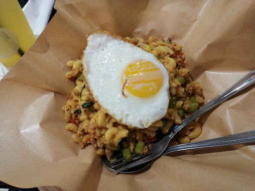 Macaroni bowls, omelets & desserts in a compact eatery with a trendy atmosphere.