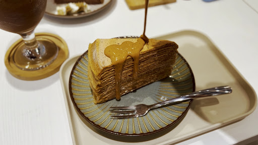 闆娘的千層個頭都挺大, 個人認為千層最能體現出店家的手藝,微帶厚度的餅皮是闆娘一層一層煎出來的,獨特的比例讓餅皮口感有著微微的Q勁,再搭配一層一層闆娘特製的夾層,口感柔滑細緻香甜感在口中一層一層化開。 最愛泰奶千層 經典的橘紅色、獨特的泰奶夾層,單吃就有淡淡的泰奶茶香,再淋上闆娘特製的泰奶淋醬,濃郁卻不膩口。