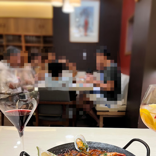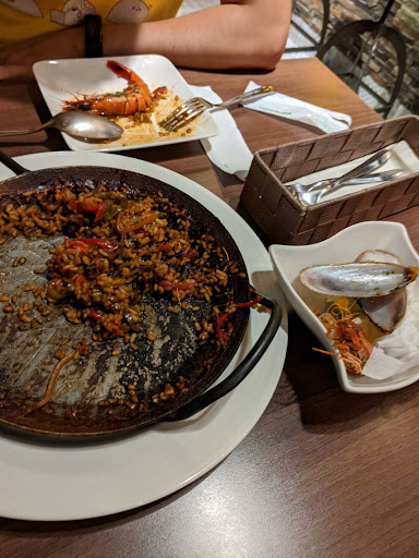 然而,先生認為既然之則安之,試試看再說吧。既然是初體驗,那麼就先從店家一入口玄關處的高腳椅座位區開始吧(不是點套餐可不被允許進入主餐廳區用餐的~)。由於餐廳內裝潢在台南算是不錯的表現,便很快一掃剛剛的陰霾,轉換為愉快期待的心情,於是就選一道"明訂必須一次點兩人份"的"經典西班牙海鮮燉飯"作為晚餐吧,總計新台幣一千多元大洋。 過沒多久,這道平底鐵鍋燉飯一端上,立刻傻眼,約僅六吋pizza盤大小外,基底米飯份量薄,舖上的海鮮: 兩隻蝦、兩隻九孔,和零星小量的花枝鬚、少少細條彩椒、和看不見番紅花也聞不到應有的香氣~ 縱然如此,我依然安慰先生,也許口感會不錯啊,畢竟香料運用和料理功夫才是高桿之處,就吃吃看吧! 於是乎,我便快挖兩匙在側盤上,一入口吃下後, OH MY GOD.......驚訝無比的感覺油然而生......怎麼會怎麼會那麼xx啊,鍋底燒焦味伴隨而來外、更別說米飯毫無高級食材的鮮味了。而實體海鮮為何分別只有個兩隻,得到的回覆是因為兩個人啊,哈哈哈哈。寫到這裡我真的是忍不住想笑。我是吃了什麼蝦呢?? 是我誤解什麼事嗎?? WHAT'S GOING ON?? 吧檯服務生很有趣,總是很關注客人用餐的一舉一動,於是上前來關心,了解訴求後,去廚房,再出來向我們稍微解釋,並客氣詢問是否能直接用湯匙採些樣品,以便留給廚師再測試。我其實和這位服務生還算愉快笑笑地聊完,想說,採到地雷就算啦,就那麼一次唄。 未料,幾分鐘後,又隨後來另一位瘦瘦年輕男子,不確定是廚師?店經理?還是老闆之子? 再出來與我們了解狀況,然後“再”挖一匙回去。寫到這裡我又忍不住想笑,呵呵呵。