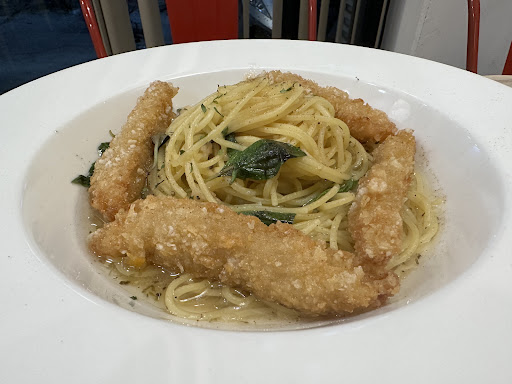 新光三越旁邊好吃的平價咖哩與義大利麵 info: 咖哩與義大利麵價格約落在150~200元的區間,有套餐組合,端出來的食物符合CP值,上菜約10分鐘左右 👍推薦:唐揚雞咖哩飯,有別於其他家平價的咖哩飯,咖哩的量就算不加價也給蠻多的,唐揚雞本身不柴調味也不錯。 ✨附餐有加點的薯條🍟炸的酥脆顏色正黃,偏粗的條狀吃得過癮,比麥當勞或摩斯漢堡的薯條好吃! ✨炸魚條蒜香清炒義大利麵口味清爽調味也不錯。附餐點的例湯也不錯喝。 唯一可惜😐的是咖哩可樂餅的咖哩味比較沒出來,吃起來也不夠軟綿細緻。 總結:餐點表現優,價格平價吃得飽,下次會想嘗試豬排咖哩飯和其他口味的義大利麵。