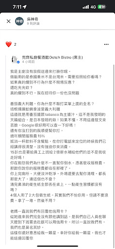 Read more來回應一下貴餐廳的指教與分享我的看法 第一點,認成台灣米我的誤會,我覺得大部分義大利燉飯煮的爛爛的是因為用長米,尤其很多都是台灣米,用義大利米比較容易煮到al dante也不會容易爛爛的,正因口感軟爛,我以為是可能真的是台灣米。而且我們會吃完是因為其他餐廳十分難訂,沒其他東西吃了,也煩請您提供照片為愚解惑。 第二點,我覺得可能當中有些誤會,我並不是要探討這到菜的起源為何,只是我在吃的時候覺得醬汁不像私廚用新鮮番茄、洋菇、蒜頭煮的醬,十分甜膩感受平庸,無意批評拿坡里義大利麵,只是貴餐廳的培根燻腸蛤蜊義大利麵,番茄醬裡我並沒有看到有番茄果肉、洋菇、蒜頭在裡面,可能我比較不細心,我不會特別把醬特別過篩,不過我覺得比較有可能的是,是現成的番茄醬煮的,我更期望能吃到更新鮮的食材,因此發表我覺得失望的看法。 第三點,感謝您的補充,電話中您說年假期間服務費是15趴是否能接受我說可以,但是在電話中,確實有確認過好幾次,電話得到的回覆是有,而現在不能刷卡,結果一名廚師說那是在聊天的過程中的內容,現場在跟我們說低消有一杯飲料而且不能刷卡,完全不清不楚,更不用說理直氣壯的態度真讓人敬佩萬分,桌上沒衛生紙、水也沒了,我們大多都自己過去拿,空盤過了十幾分鐘也沒人收,其中一盤沒吃完服務生直接把桌上垃圾丟進去,也沒任何表示。況且現場最多兩桌,工作人員有四個人,疑慮的不是服務費是服務本身,收支平衡可能並不容易是您辛苦的地方,但體現在額外的消費卻不能發表看法,我也覺得冤枉。而你不回應不倒水掰後面廁所那段完全是子虛烏有,這樣造謠我也懶得多言,當下沒垃圾桶跟空盤在過敏期間只能暫時放桌上,感謝辛勤的服務生了。 最後,澄清一下我女友跟本沒有留言,感覺您可能罵到其他客人了,很不好意思發表用餐體驗讓你被遷怒。啊我們桌餐品也有干貝,雖然我覺得有煎過比較好吃,但干貝給的很大方,熟度也很剛好,也沒覺得不好吃啊,你們那些冒犯甚至不實的言論我覺得有點過了哦,畢竟均消快600吃到我覺得不符合期望的私廚料理會被這樣講,覺得不符期待,說我覺得失望,會被那樣針對的回覆...