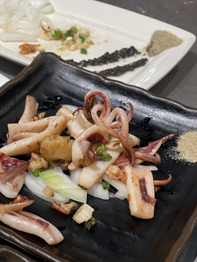 Food overall - veggies will come out first. Add for seasoning if you need any. The food is just okay. Not overcooked/undercooked. Needs more flavor. They do give you pepper on the side. Portion isn’t too big so keep that in mind. Also keep in mind. Food doesn’t come out within 5 minutes of each other. We got our squid 15 min after we finished the rest of the food.