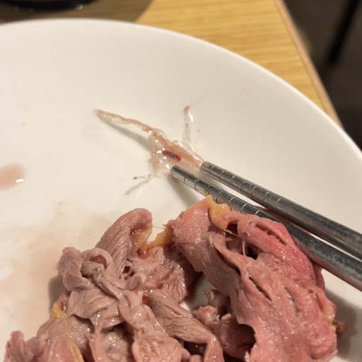 接下來問題來了,首先超貴, 一盤肉約三到五百,自助吧兩百多,鍋底也算錢,還加收清潔費, 這餐結算下來就算沒點牛肉還是近一千二, 其中雞肉還有首次會員折抵,整餐比西堤還貴, 其他評論不知道是不是有活動還怎麼樣,各種吹CP值我完全感覺不到, 拍照和廣告看起來肉很大盤很浮誇, 但實際上都是薄片,重量沒多少, 拿比較厚實的雞肉對比就能看出一份肉沒多少, 一盤近五百的肉也就差不多是隔壁南紡Momo的兩盒肉,幾口就沒了,但Momo的肉可以無限加點。