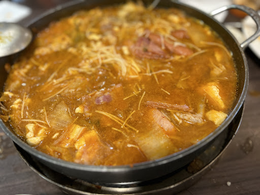 🍲起司部隊鍋 超級澎湃的部隊鍋,食材有培根德國香腸、豬肉片、年糕條、豆腐、黃豆芽、泡菜、洋蔥、金針菇、蔥、起司、韓式拉麵,開火待滾後, 湯頭裡充滿泡菜的辣,喝著超...