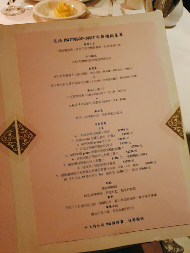 Food was average but totally not worthy that price. Overpriced. Ordered the fillet main at the price of NT3280 without any drinks. 2 of us spent over NT 7000.The potion & taste of foods both were disappointed. Surprised me that the staff even didn’t check with customer for the steak doneness before serving. Also Very upset with only Cash payment. This is a fine dining 30 years old French restaurant which one dish costs at least over NT2000. Without card payment and it really make us felt embarrassed at the end and inconvenience. Anyway , it will be the first and last . I love French food but never got experience like this so disappointed ☹️ Not feeling...