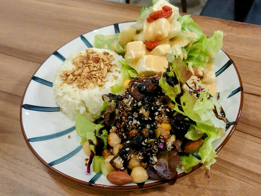 塔可飯沙拉(五辛):肉醬濃郁帶點微辣,加上多力多滋與番茄點綴,香氣十足超下飯。