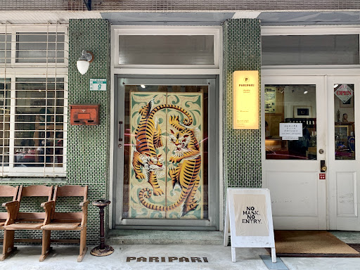 PARIPARI apt,是由「鳥飛古物店」與「St1 Café」共同創辦的古物、咖啡、民宿(預計),的經典空間,一棟三層樓的公寓,與附近的街景建築,都是同一時期的老房子,二丁掛磁磚、小丁掛磁磚滿佈牆面;猶記得,位在舊眷村改建的奶奶家,公寓上也遍佈著紅色、綠色、米色的丁掛磚面,這種「數大便是美」需要耐心與時間,片片貼上的工藝技術,有著獨特的節奏與美麗。
