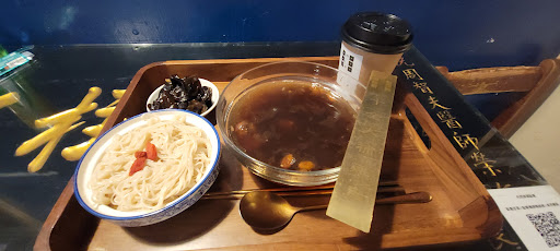 Really unique and difficult to describe. The staff welcomes you recommending you not to eat certain soups if you're on your period. The soup itself is a broth made of spices and oil, the taste is difficult to describe but it's delicate and a bit bitter. Soup comes with pork meat and a generous side of oyster mushrooms The noodles portion is also generous. My palate had troubles understanding what was I eating, but I enjoyed it. The set comes with tea and a dessert. I chose red beans with tangerine. It's worth for the experience, tho I'm not sure I'd eat...